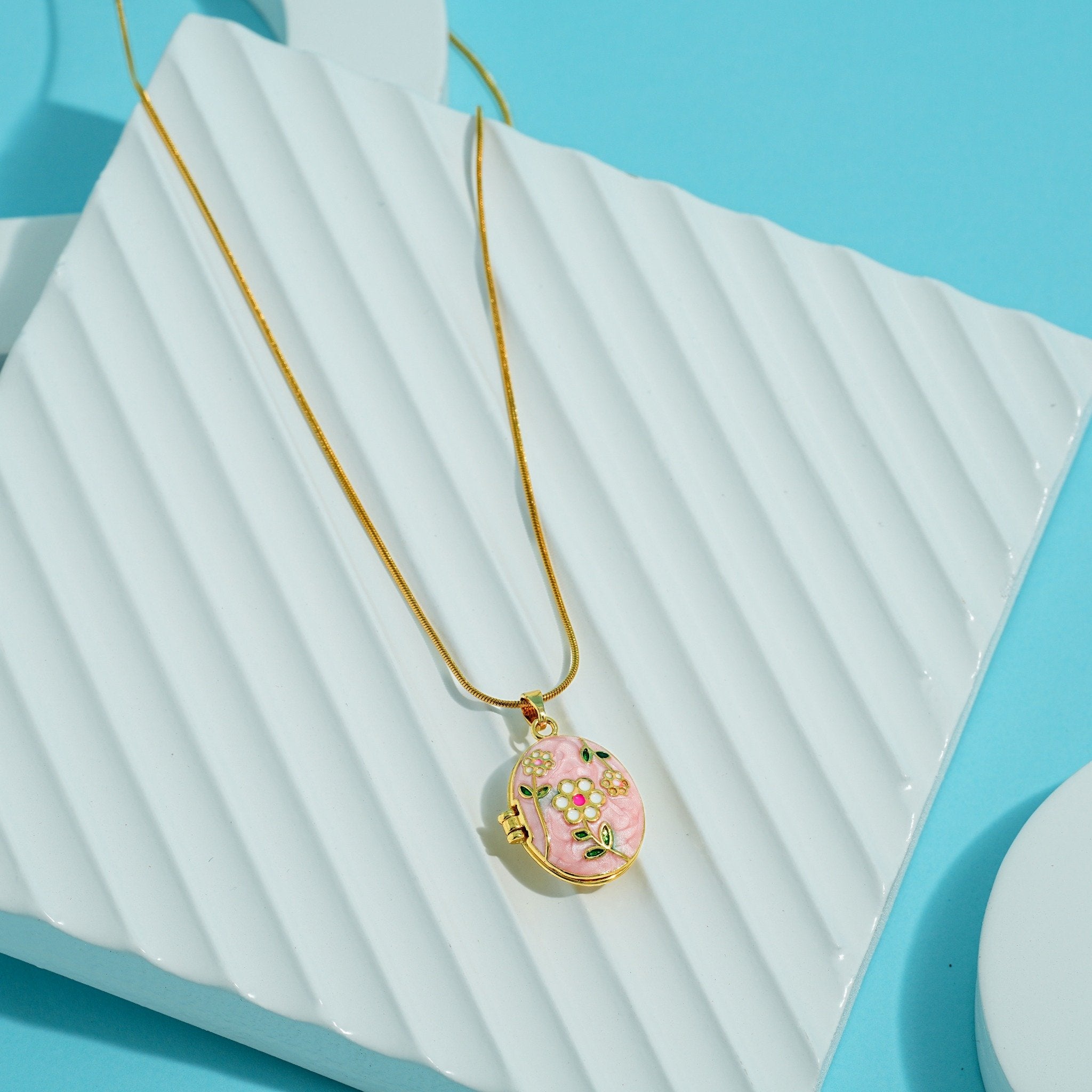 Add a touch of timeless beauty to your jewelry collection with the Blossom Charm Locket 18 Carat Gold Finished PVD Coated Anti-Tarnish Necklace. Designed with a delicate blossom-inspired locket pendant, this necklace symbolizes love, growth, and cherished memories. Finished with premium 18-carat gold PVD coating, it offers long-lasting shine and excellent resistance to tarnish, making it ideal for everyday wear. Lightweight and comfortable, it pairs effortlessly with casual, office, and festive outfits. The locket design allows you to keep special moments close while adding graceful elegance to your look. Wear it solo for a refined statement or layer it for modern styling. This necklace beautifully blends sentimental value, floral charm, and luxurious craftsmanship into a meaningful and stylish accessory.