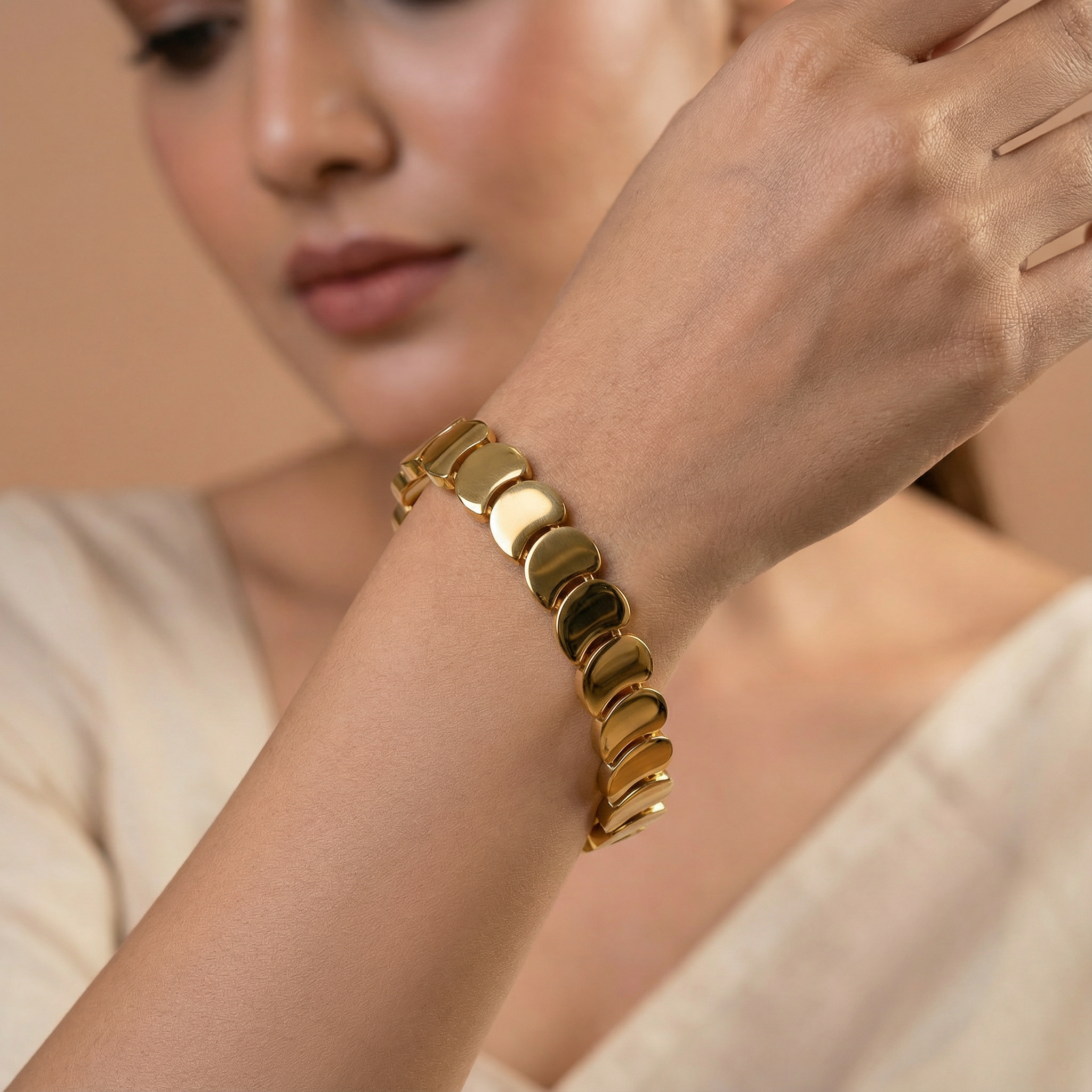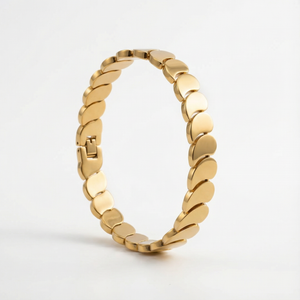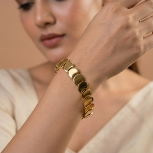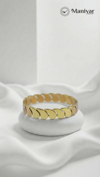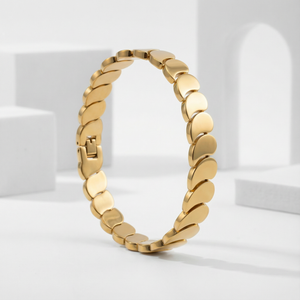 Add a touch of floral elegance to your everyday style with the Golden Petal Link 18 Carat Gold Finished PVD Coated Anti-Tarnish Bracelet. Featuring a beautifully crafted petal-inspired link design, this bracelet blends delicate beauty with modern sophistication. Finished with premium 18-carat gold PVD coating, it offers long-lasting shine and excellent resistance to tarnish for worry-free wear. Lightweight and comfortable, it rests gracefully on the wrist and complements casual, office, and festive outfits effortlessly. Wear it alone for a refined statement or stack it with other bracelets for a chic layered look. The Golden Petal Link Bracelet combines nature-inspired charm, durability, and luxurious craftsmanship into a versatile jewelry essential.