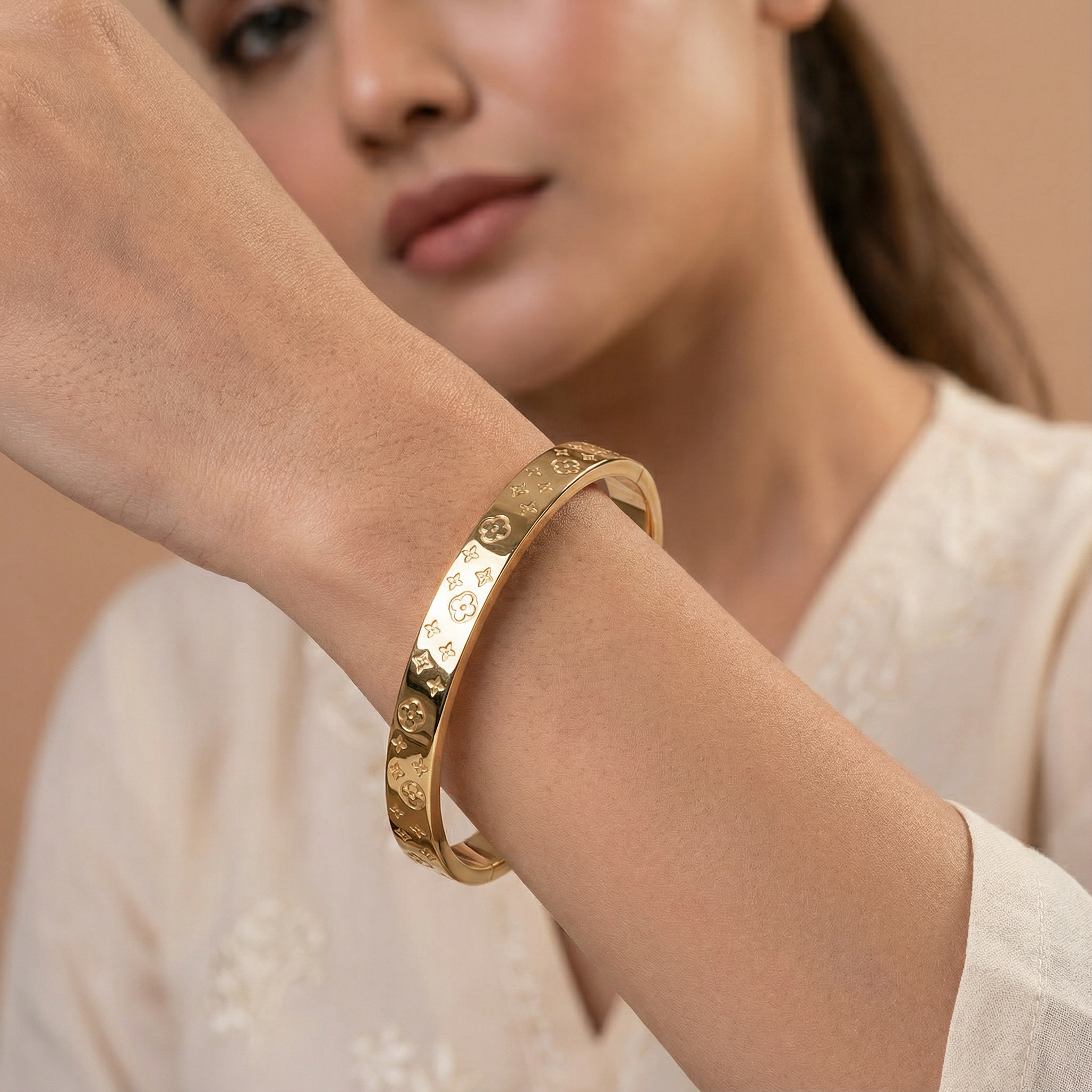Add a touch of floral grace to your everyday style with the Golden Petal Charm 18 Carat Gold Finished PVD Coated Anti-Tarnish Bracelet. Featuring a delicately crafted petal-inspired charm, this bracelet symbolizes beauty, growth, and refined elegance. Finished with premium 18-carat gold PVD coating, it offers long-lasting shine and excellent resistance to tarnish for worry-free daily wear. Lightweight and comfortable, it rests gracefully on the wrist and pairs effortlessly with casual, office, and festive outfits. Wear it alone for a subtle statement or stack it with other bracelets for a chic layered look. The Golden Petal Charm Bracelet blends nature-inspired design, modern craftsmanship, and luxurious durability into a versatile jewelry essential.