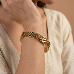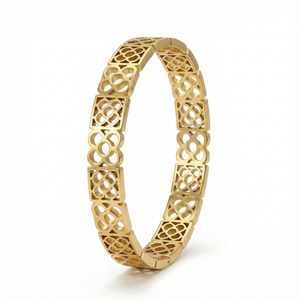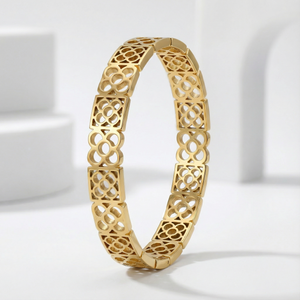 Add a touch of refined artistry to your wrist with the Golden Harmony Lattice 18 Carat Gold Finished PVD Coated Anti-Tarnish Bracelet, designed to symbolize balance and elegance. Featuring an intricate lattice pattern with graceful symmetry, this bracelet creates a sophisticated and eye-catching statement. Finished with premium 18-carat gold PVD coating, it offers long-lasting shine and excellent resistance to tarnish for everyday wear. Lightweight and comfortable, it pairs effortlessly with casual, office, and festive outfits. Wear it alone for subtle sophistication or stack it with other bracelets for a chic layered look. The Golden Harmony Lattice Bracelet blends detailed craftsmanship, modern design, and luxurious durability into a versatile jewelry essential.