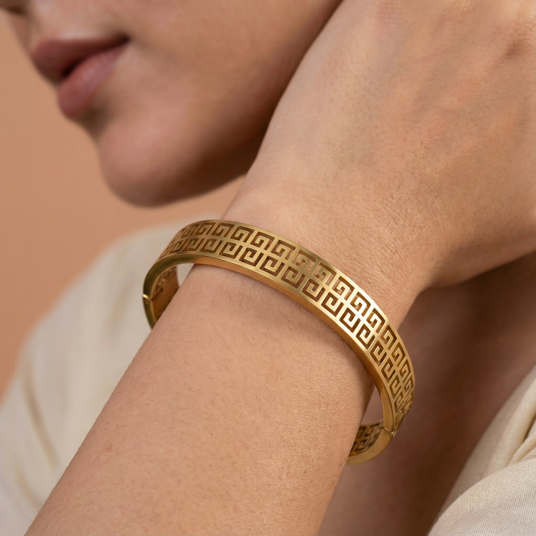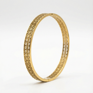 Embrace timeless sophistication with the Golden Greek Key Elegance 18 Carat Gold Finished PVD Coated Anti-Tarnish Bracelet, inspired by classical beauty and refined design. Featuring the iconic Greek key pattern symbolizing eternity and unity, this bracelet adds a bold yet elegant statement to your wrist. Finished with premium 18-carat gold PVD coating, it offers long-lasting shine and excellent resistance to tarnish for everyday confidence. Lightweight and comfortable, it pairs effortlessly with casual, office, and festive outfits. Wear it alone for a refined look or stack it with other bracelets for a chic layered style. The Golden Greek Key Elegance Bracelet blends heritage-inspired artistry, durability, and luxurious craftsmanship into a versatile jewelry essential.