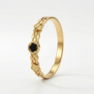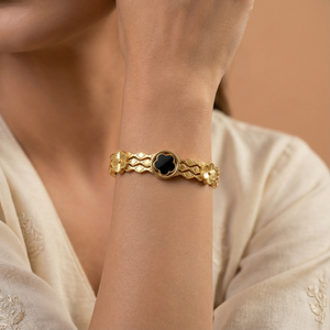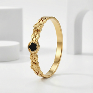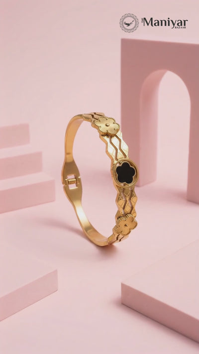 Add a touch of bold elegance to your wrist with the Midnight Clover Gold 18 Carat Gold Finished PVD Coated Anti-Tarnish Bracelet, designed to symbolize luck, beauty, and modern sophistication. Featuring a striking clover motif accented with deep midnight tones, this bracelet creates a refined contrast that stands out with graceful charm. Finished with premium 18-carat gold PVD coating, it ensures long-lasting shine and excellent resistance to tarnish for everyday confidence. Lightweight and comfortable, it pairs effortlessly with casual, office, and festive outfits. Wear it alone for a chic statement or stack it with other bracelets for a stylish layered look. The Midnight Clover Gold Bracelet blends timeless symbolism, contemporary design, and luxurious craftsmanship into a versatile jewelry essential.