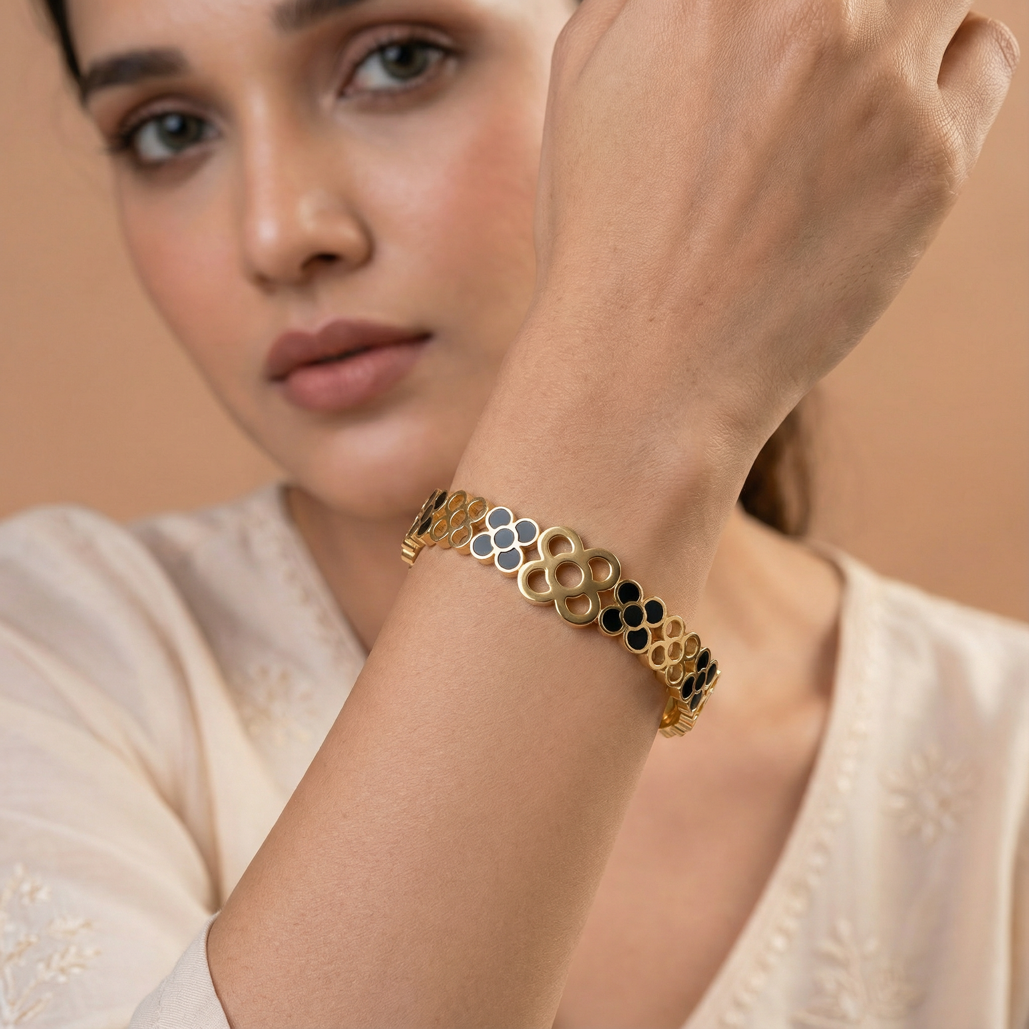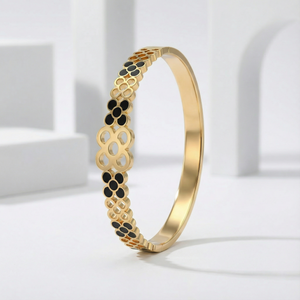 Add bold elegance to your style with the Black Floral Gold 18 Carat Gold Finished PVD Coated Anti-Tarnish Bracelet, designed to blend classic beauty with modern contrast. Featuring a refined floral motif accented with striking black detailing, this bracelet creates a sophisticated and eye-catching statement. Finished with premium 18-carat gold PVD coating, it offers long-lasting shine and excellent resistance to tarnish for everyday wear. Lightweight and comfortable, it sits gracefully on the wrist and pairs effortlessly with casual, office, and festive outfits. Wear it alone for a refined look or stack it with other bracelets for a chic layered style. The Black Floral Gold Bracelet combines floral artistry, contemporary design, and luxurious craftsmanship into a timeless accessory.