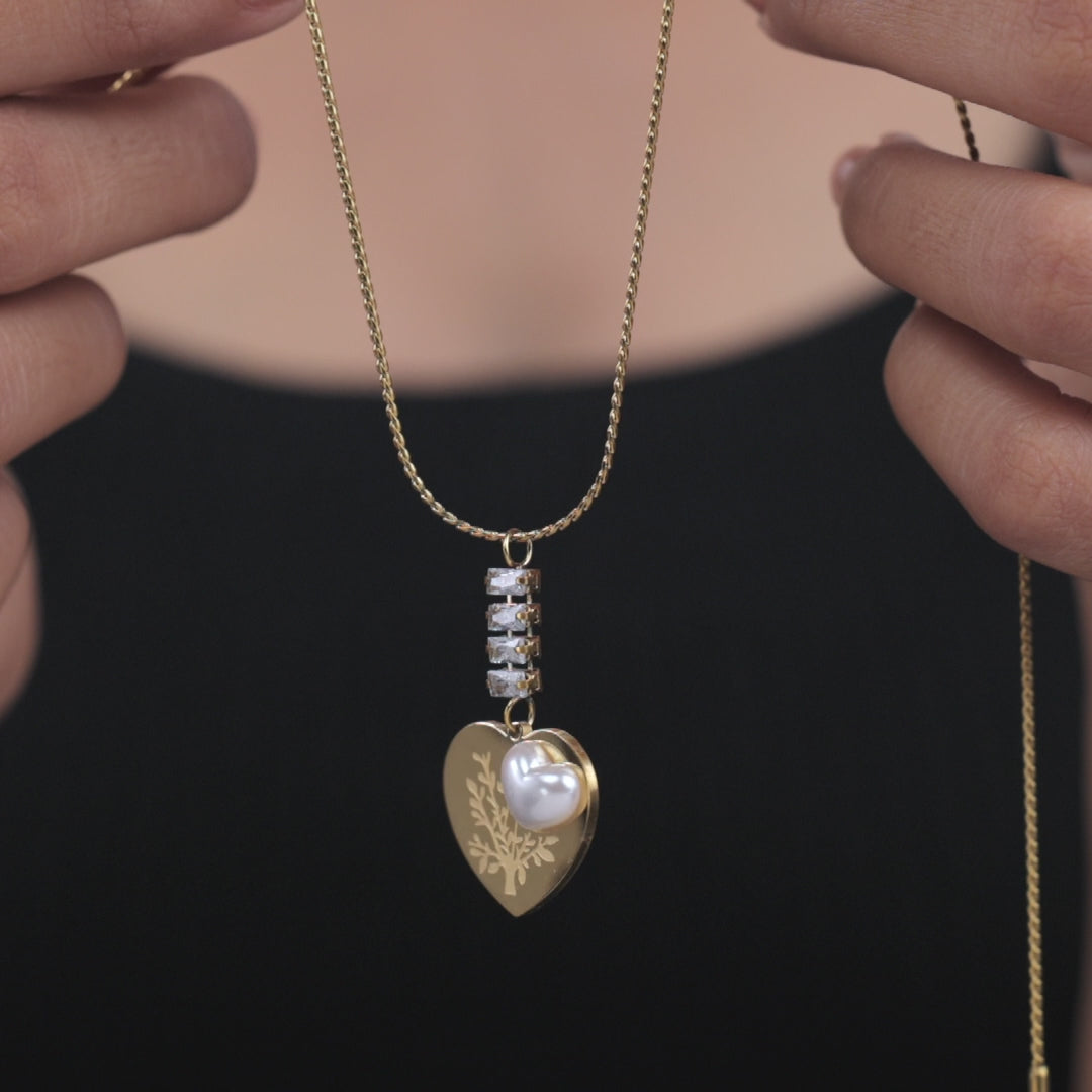 Gold heart pendant necklace with engraved tree design, small pearl heart, and rectangular crystals