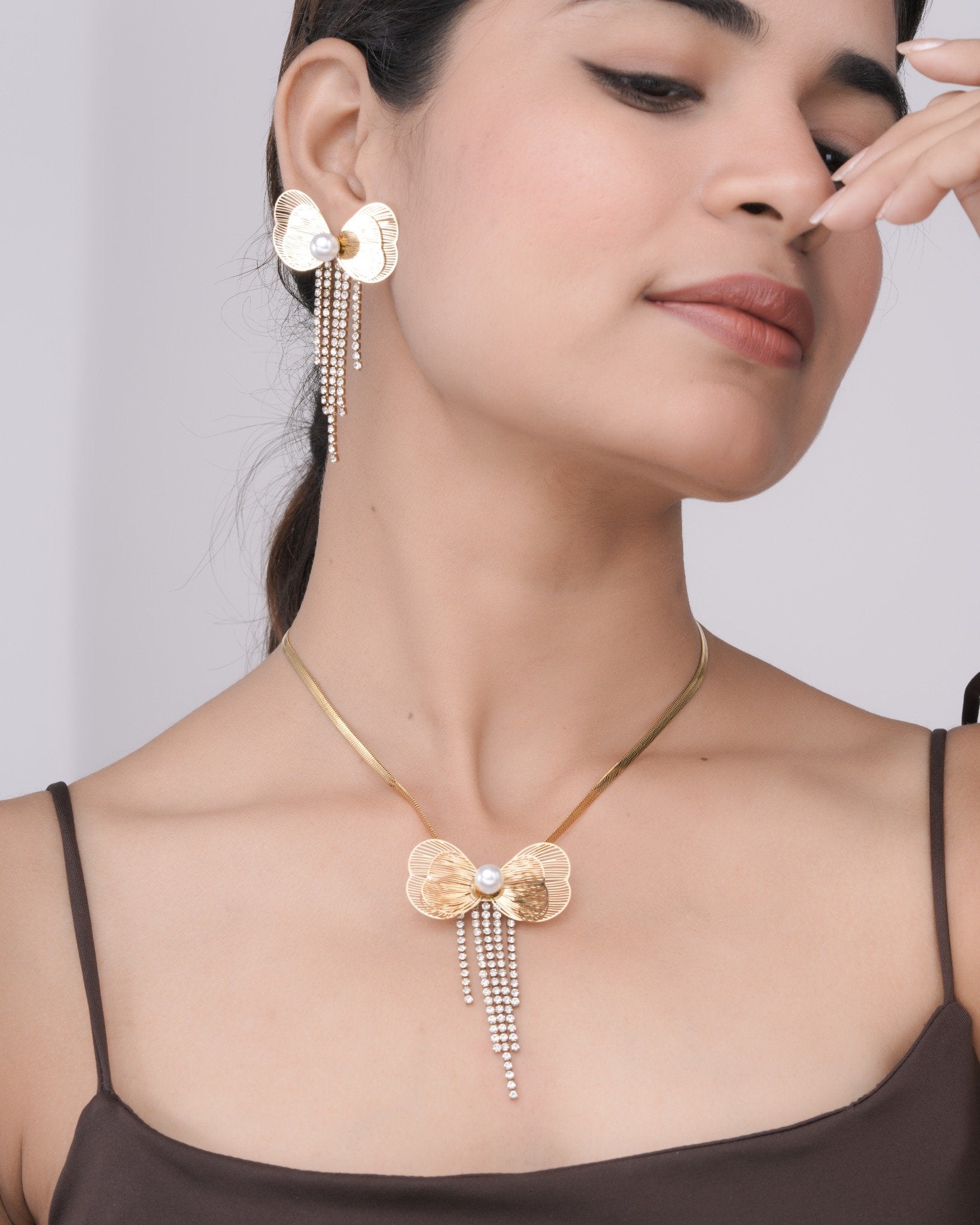 Add graceful charm to your jewelry collection with the Pearl Bowfall Radiance 18 Carat Gold Finished PVD Coated Anti-Tarnish Set, designed to blend feminine elegance with radiant luxury. Featuring a delicate bow-inspired motif paired with luminous pearls in a soft cascading design, this set creates beautiful movement and timeless appeal. Finished with premium 18-carat gold PVD coating, it offers long-lasting shine and excellent resistance to tarnish, making it ideal for everyday wear and special occasions. Lightweight and comfortable, it complements ethnic, western, and festive outfits effortlessly. Perfect for coordinated styling or gifting, this set brings classic pearl beauty, modern design, and refined sophistication together in one elegant ensemble.