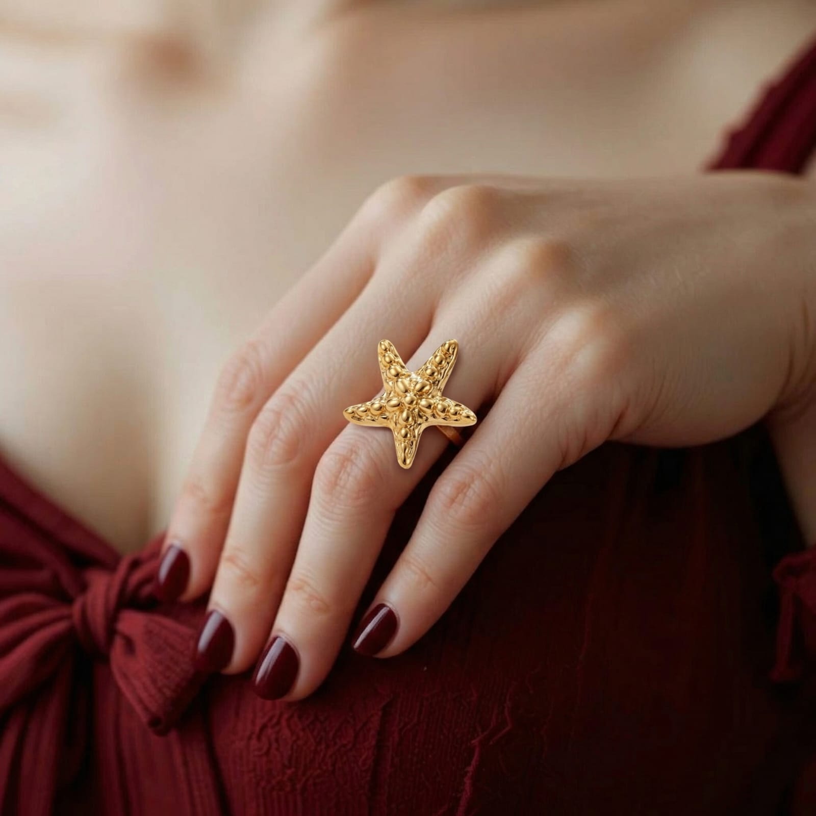 Add a touch of celestial floral charm to your style with the Golden Starlet Bloom 18 Carat Gold Finished PVD Coated Anti-Tarnish Ring, designed to blend starlight elegance with delicate beauty. Featuring a refined bloom-inspired motif with star-like detailing, this ring creates a graceful and modern statement. Finished with premium 18-carat gold PVD coating, it offers long-lasting shine and excellent resistance to tarnish for everyday confidence. Lightweight and comfortable, it pairs effortlessly with casual, office, and festive outfits. Wear it alone for a subtle sparkle or stack it with other rings for contemporary styling. The Golden Starlet Bloom Ring blends celestial inspiration, floral artistry, and luxurious craftsmanship into a timeless jewelry essential.