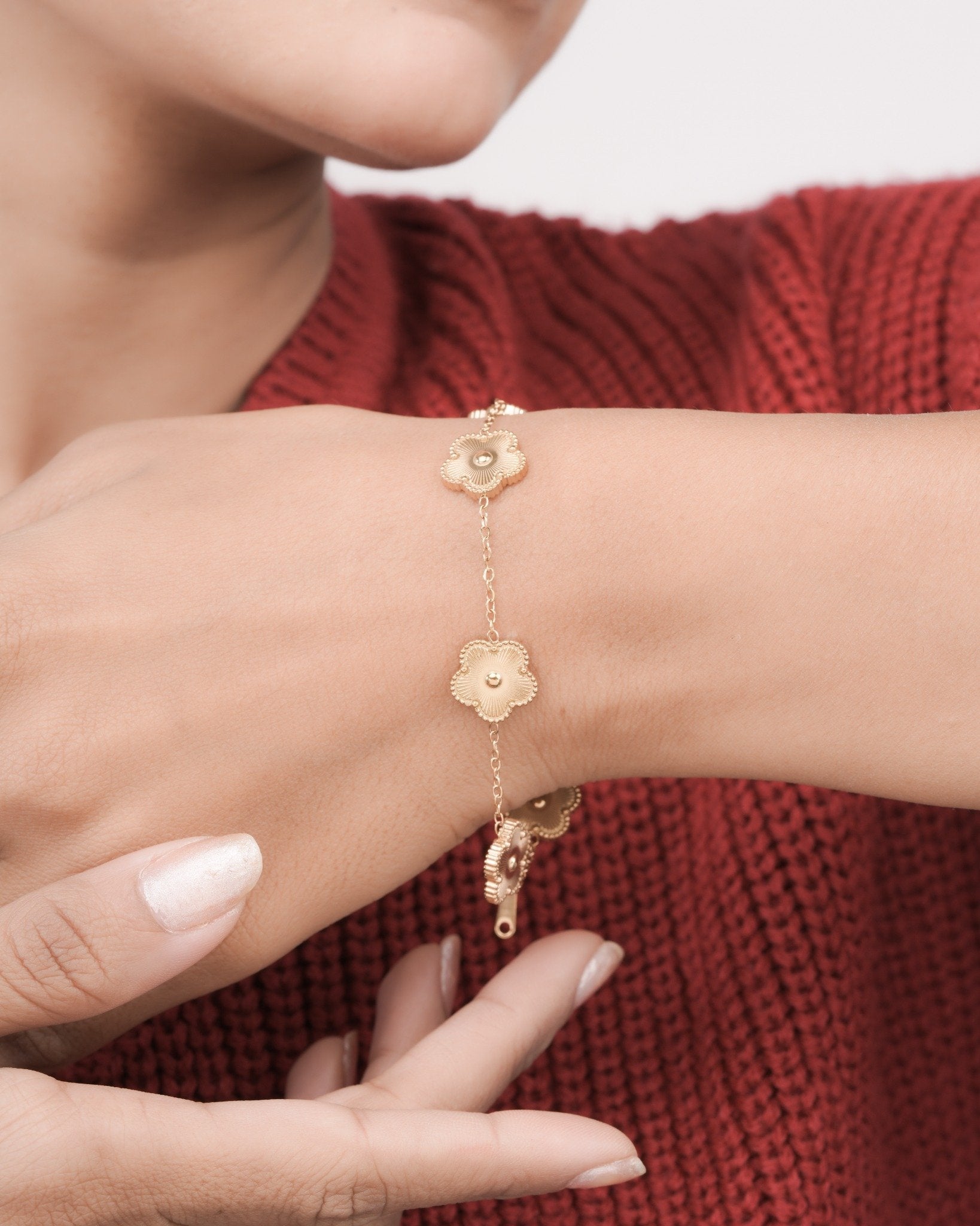 Add a graceful floral touch to your everyday style with the Golden Bloom Anti Tarnish Bracelet. Inspired by the beauty of a blooming flower, this bracelet reflects elegance, positivity, and timeless charm. Crafted with a premium anti-tarnish finish, it offers long-lasting shine and durability, making it perfect for regular wear. Lightweight and comfortable, it sits beautifully on the wrist and pairs effortlessly with casual, office, and festive outfits. Wear it alone for a subtle statement or stack it with other bracelets for a modern layered look. The Golden Bloom Bracelet brings refined femininity and effortless sophistication to your jewelry collection.