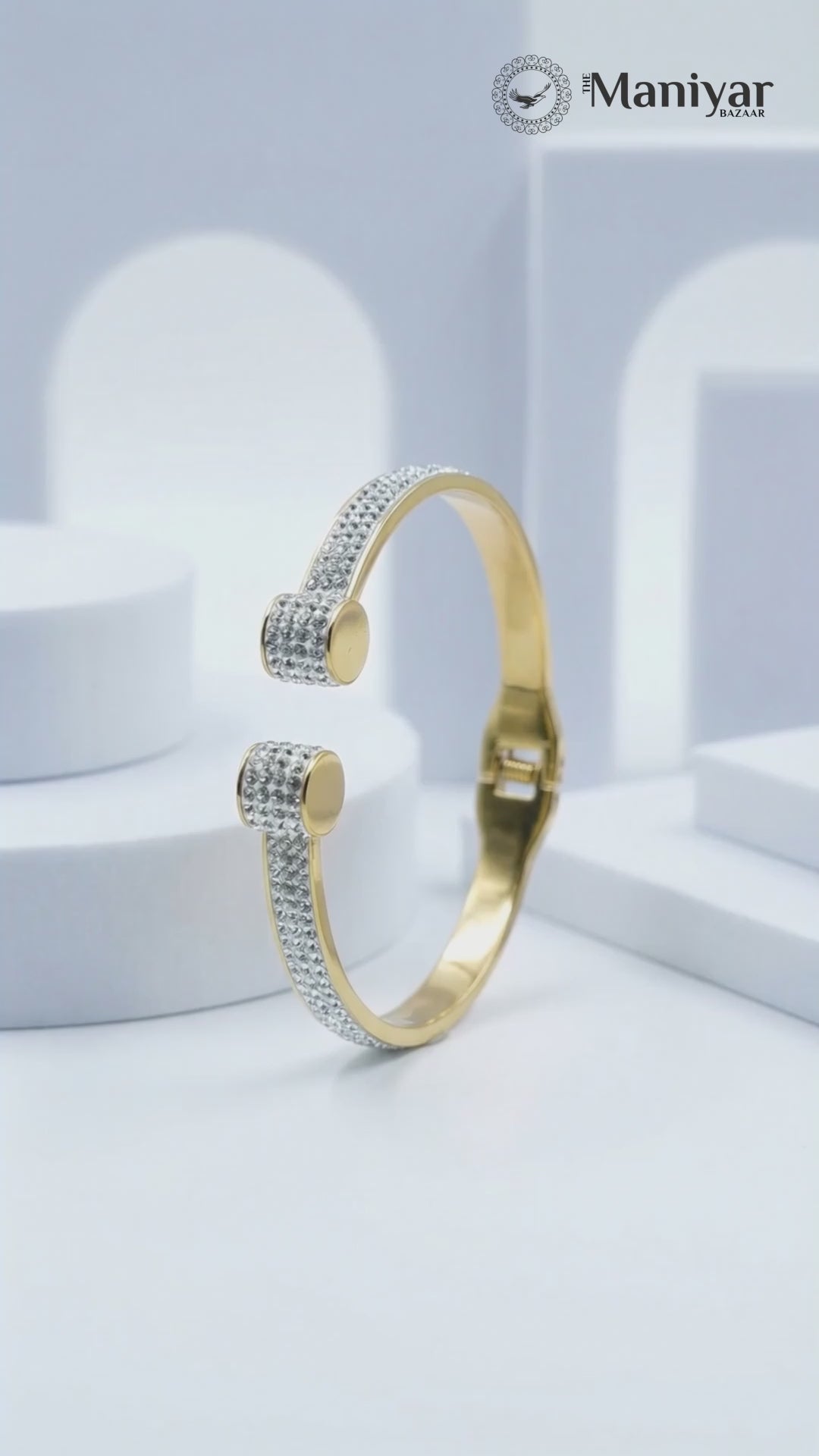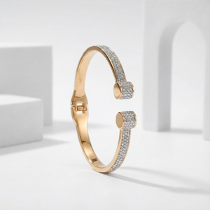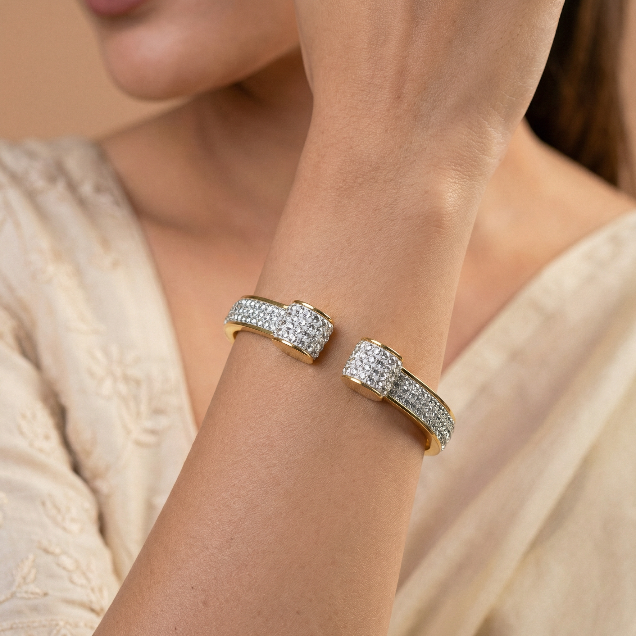 Add a touch of modern glamour to your look with the Twin Sparkle Cuff 18 Carat Gold Finished PVD Coated Anti-Tarnish Bracelet. Designed with a sleek open-cuff silhouette and twin sparkling accents, this bracelet reflects balance, elegance, and contemporary style. Finished with premium 18-carat gold PVD coating, it offers long-lasting shine and excellent resistance to tarnish, making it perfect for everyday wear. Lightweight and comfortable, it pairs effortlessly with casual, office, and evening outfits. Wear it alone for a refined statement or stack it with other bangles for a chic layered look. The Twin Sparkle Cuff Bracelet blends minimalist design, durability, and luxurious craftsmanship into a versatile jewelry essential.