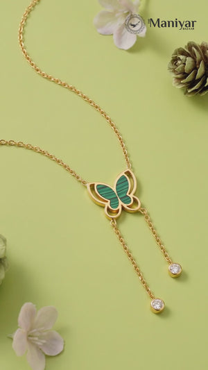 Add a touch of enchanting elegance to your look with the Emerald Butterfly Drop 18 Carat Gold Finished PVD Coated Anti-Tarnish Necklace. Featuring a beautifully crafted butterfly motif paired with a radiant emerald-toned drop, this necklace symbolizes transformation, beauty, and refined charm. Finished with premium 18-carat gold PVD coating, it offers long-lasting shine and superior resistance to tarnish, making it perfect for everyday wear. Lightweight and comfortable, it complements casual, office, and festive outfits effortlessly. Wear it solo for a graceful statement or layer it for modern styling. The Emerald Butterfly Drop Necklace blends nature-inspired design with luxurious craftsmanship for a timeless and elegant jewelry essential.