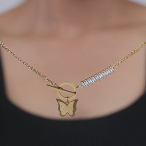 Gold-toned chain necklace with toggle clasp, adorned with clear crystals and a butterfly charm